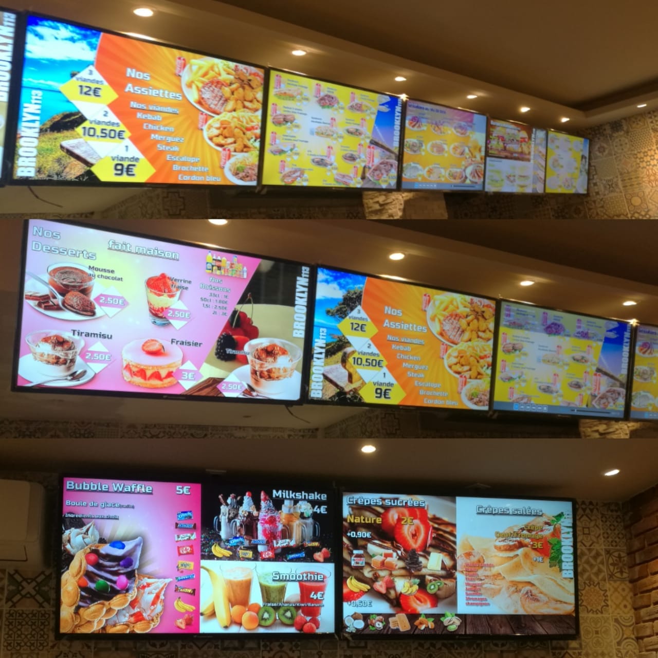 Ensuite, nous avons fixé les TV dans le fastfood en utilisant des supports robustes et solides pour assurer la stabilité des écrans. Nous avons ensuite créé les menu boards dynamiques qui ont été installés sur les écrans. Nous avons utilisé des images accrocheuses et des graphismes dynamiques pour attirer l’attention des clients.