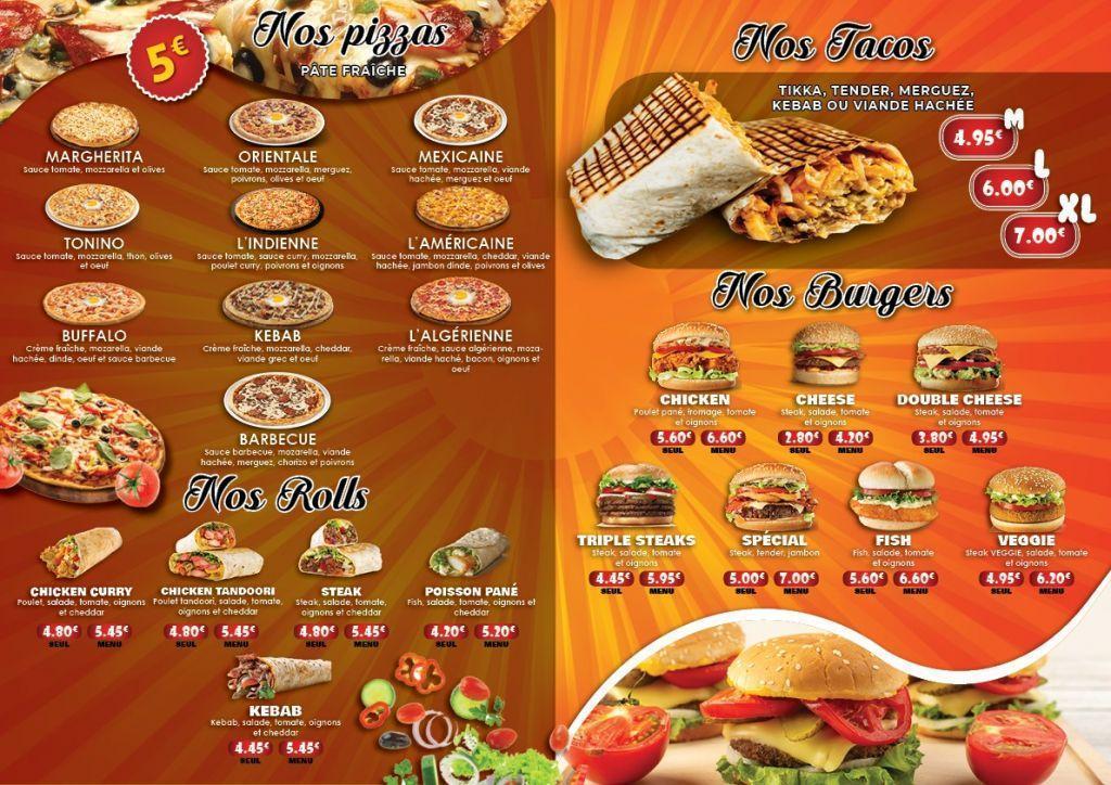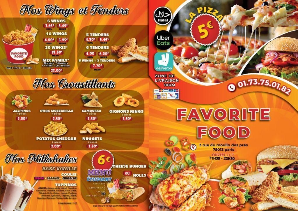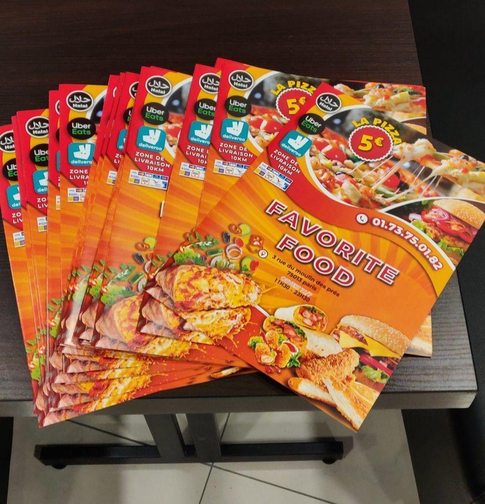 La réalisation de 5 Menu Dynamique (Burger, Pizza, Tacos, Croustillants, Dessert Salade) ainsi que la création d’un adhésif vitrine et d’un dépliant personnalisé pour Favourite Food à Paris a été une prestation réalisée avec succès.