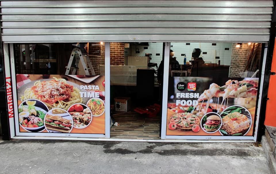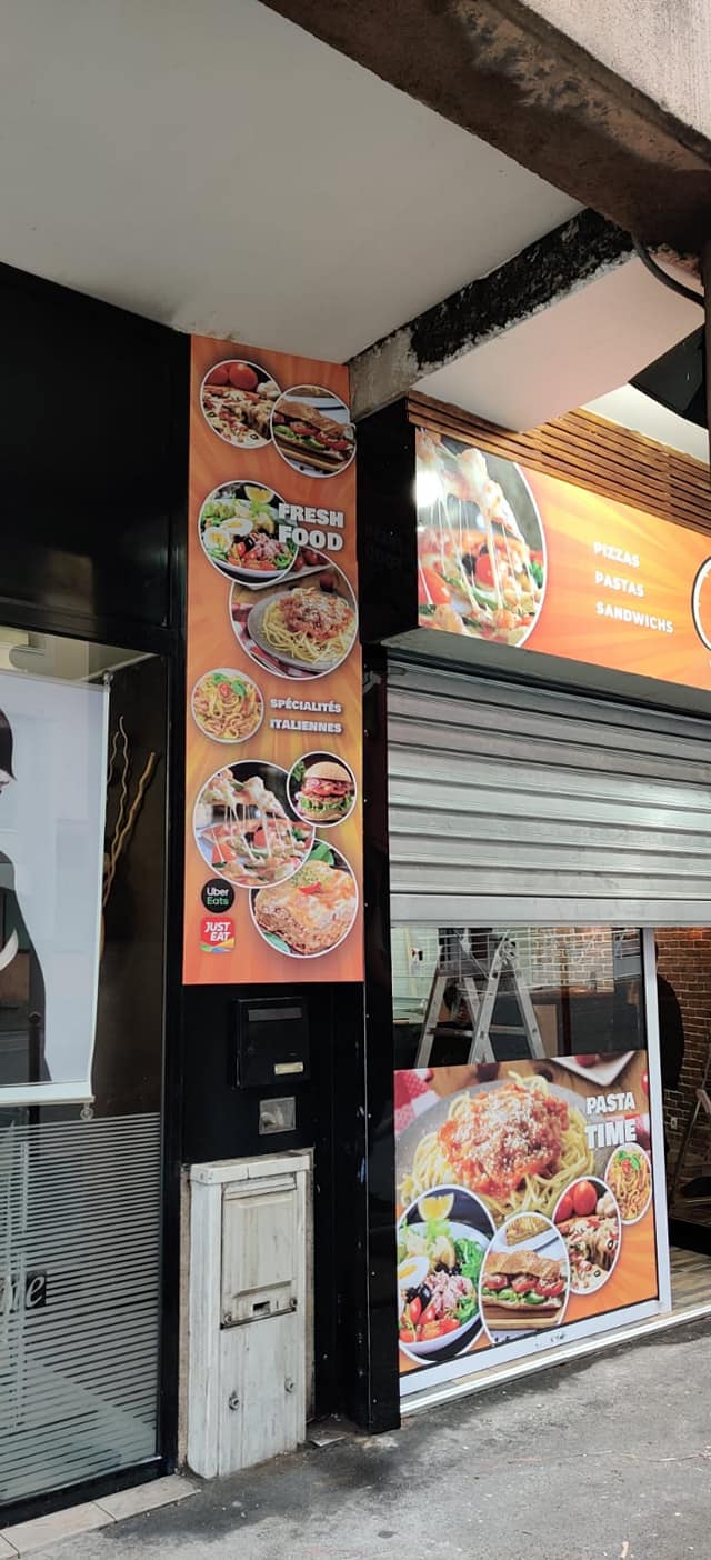 Nous avons ensuite travaillé sur la conception de l’enseigne vitrine, qui est souvent le premier élément que les clients voient lorsqu’ils passent devant le fastfood. Nous avons utilisé des couleurs et des graphismes cohérents avec l’identité visuelle de l’entreprise pour créer une enseigne qui attire l’attention des clients potentiels et les invite à entrer.