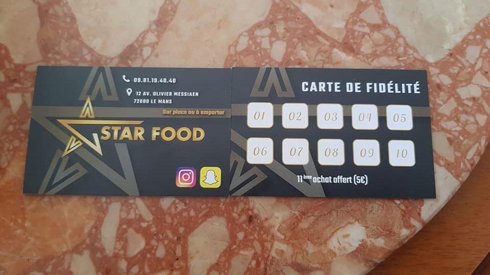Enfin, nous avons créé des cartes de fidélité pour les clients réguliers, leur offrant des avantages et des récompenses exclusives. Les cartes de fidélité ont été conçues en cohérence avec l’identité visuelle de STARFOOD, offrant une expérience de marque cohérente et homogène.